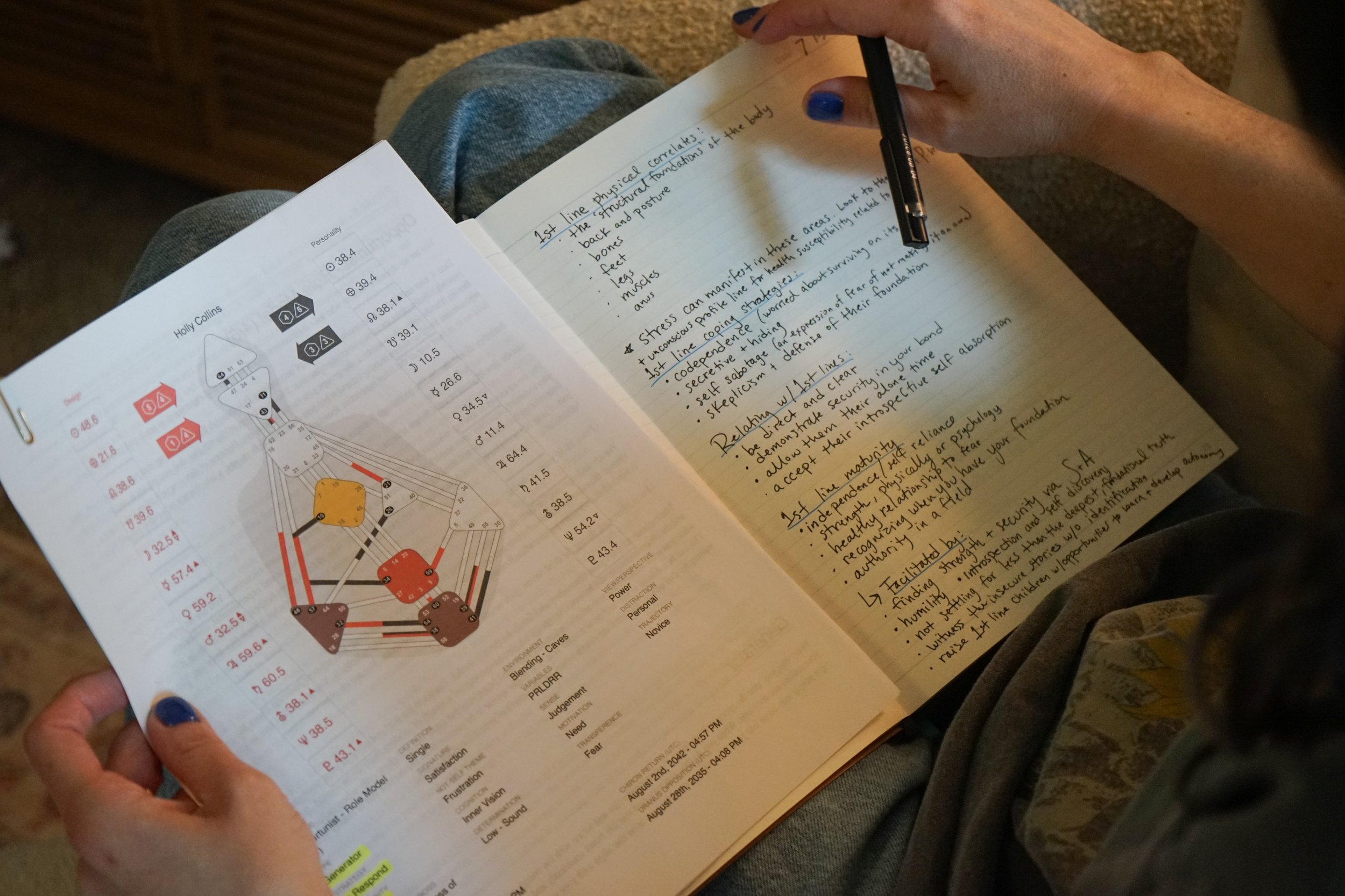 Human Design is a synthesis of ancient systems (astrology, the Chinese I’Ching, the Hindu Chakra system, The Kabbalah Tree of Life) and modern science (quantum mechanics, astronomy, genetics, and biochemistry.) Like astrology, your birth information is used to calculate your chart. Human Design offers a way to see yourself as the uniquely designed human being that you are. The point of sitting with your chart is to observe and accept yourself. To contemplate the themes and archetypes present, rather than to improve of fix yourself. It is meant to be an experiment, and it's highest use contributes to building a loving and trusting relationship with yourself.
